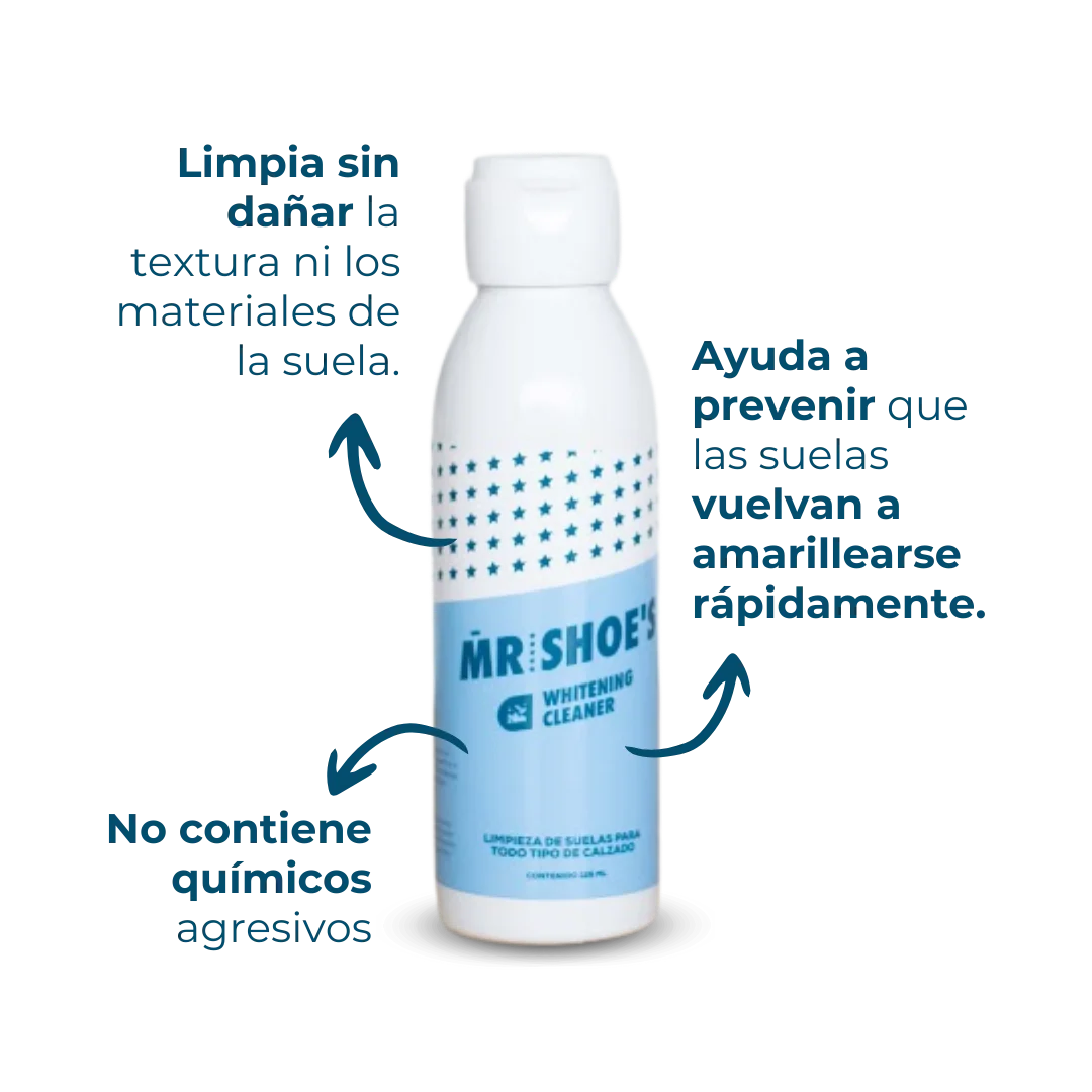Whitening Cleaner, es reconocido como uno de los desmanchadores de suelas mas efectivos y confiables para su calzado. Su formula avanzada, con ingredientes de alta calidad, elimina el color pálido (amarillo) de tus suelas, devolviendo notablemente su color original haciéndolos lucir como nuevos y bien cuidados.